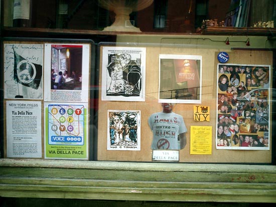 Saturday evening brought thousands of bells and their owners to “the socket” and the utter bewilderment of puzzled Ground Zero pilgrim/tourists and vendors [photos]. The Calatrava “temporary” entrance to the PATH trains became a pagoda for the bells, where volunteers gave us programs that looked like LIRR train schedules. intending to ‘orchestrate’ the event, with the occasional hissing of Buddhists who were angered by gentle nearby conversation, created a soundscape only defiled later by a guy who worked the city the whole week with a big Freddy Phelps-like scroll of a sign quoting some scripture confirming why we must vote for Bush. Upon his arrival, the press was no longer interested in Pauline Oliveros’s ambitious memorial: the jingle bells, Tibetan bells chimes, and at least one industrial lampshade being thumped like a muffled gong.